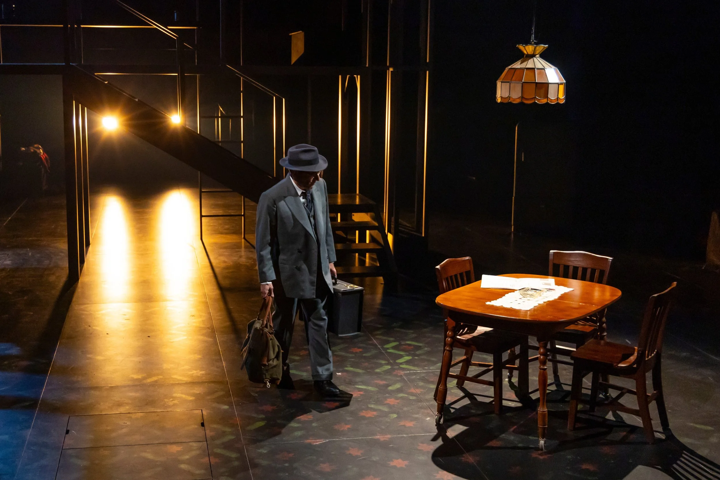 Directed by Liz Diamond from a translation by Derek Prouse adapted by Frank Galati, with choreography by Emily Coates, the Yale Rep's Rhinoceros (playing through March 28), is fluid and fast, funny and frightening, with quick-change scenery in Jennifer Yuqing Cao's Scenic Design, complemented by many subtle effects in Donald Holder's Lighting Design and very effective and evocative Projection Design by Ke Xu. Then there's the Sound Design by Xi Lin, capable of giving a reality to those rhinos that become so overwhelming. Costumes, by Tricie Bergman, are visually splendid (there's a "funny papers" look to the whole) and, with shadowy lighting, suggest just enough of what the previously-human pachyderms might look like.