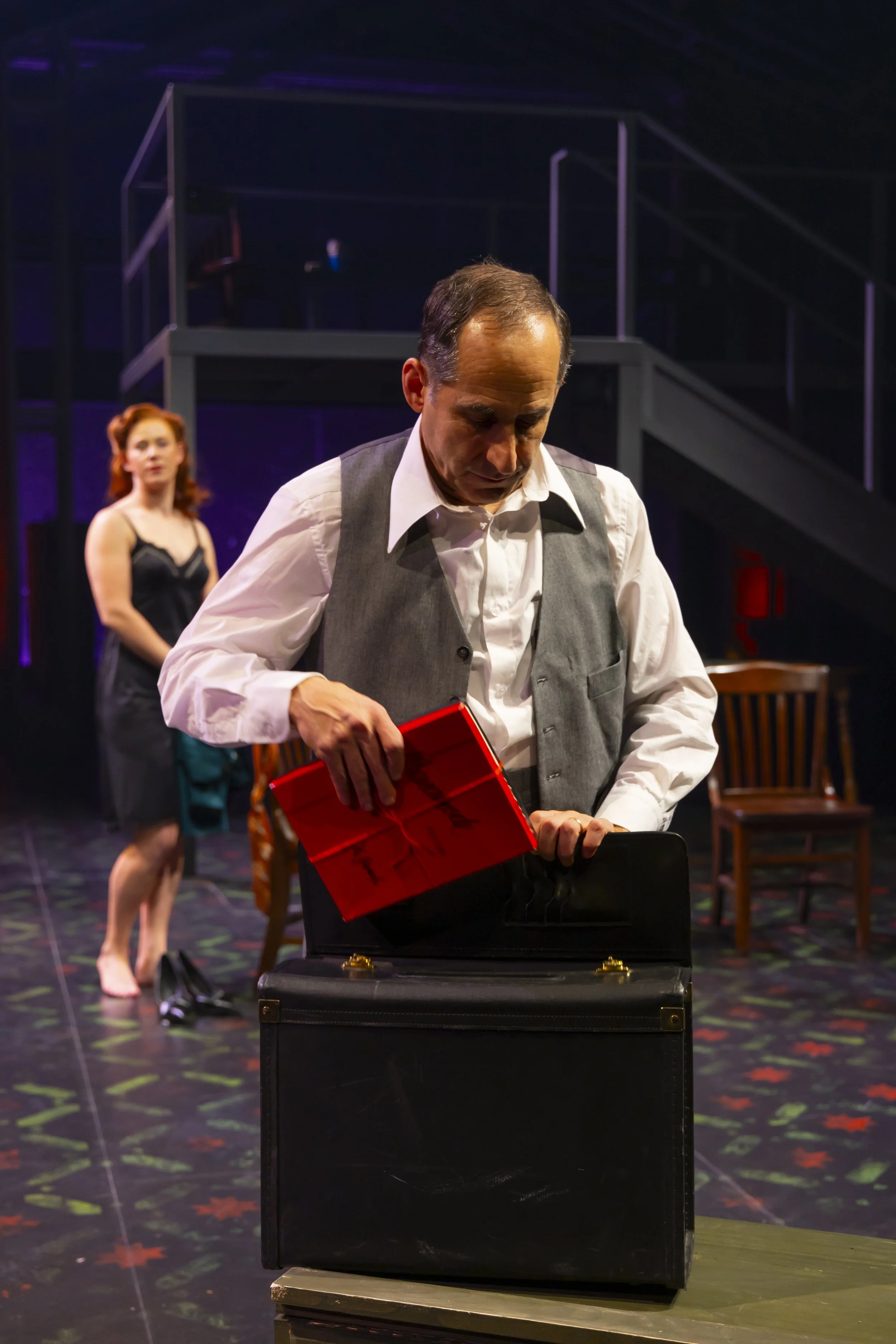 The Woman (Nora Eschenheimer), Willy (Peter Jacobson) in Death of a Salesman, directed by Melia Bensussen, Hartford Stage; photo by T. Charles Erickson