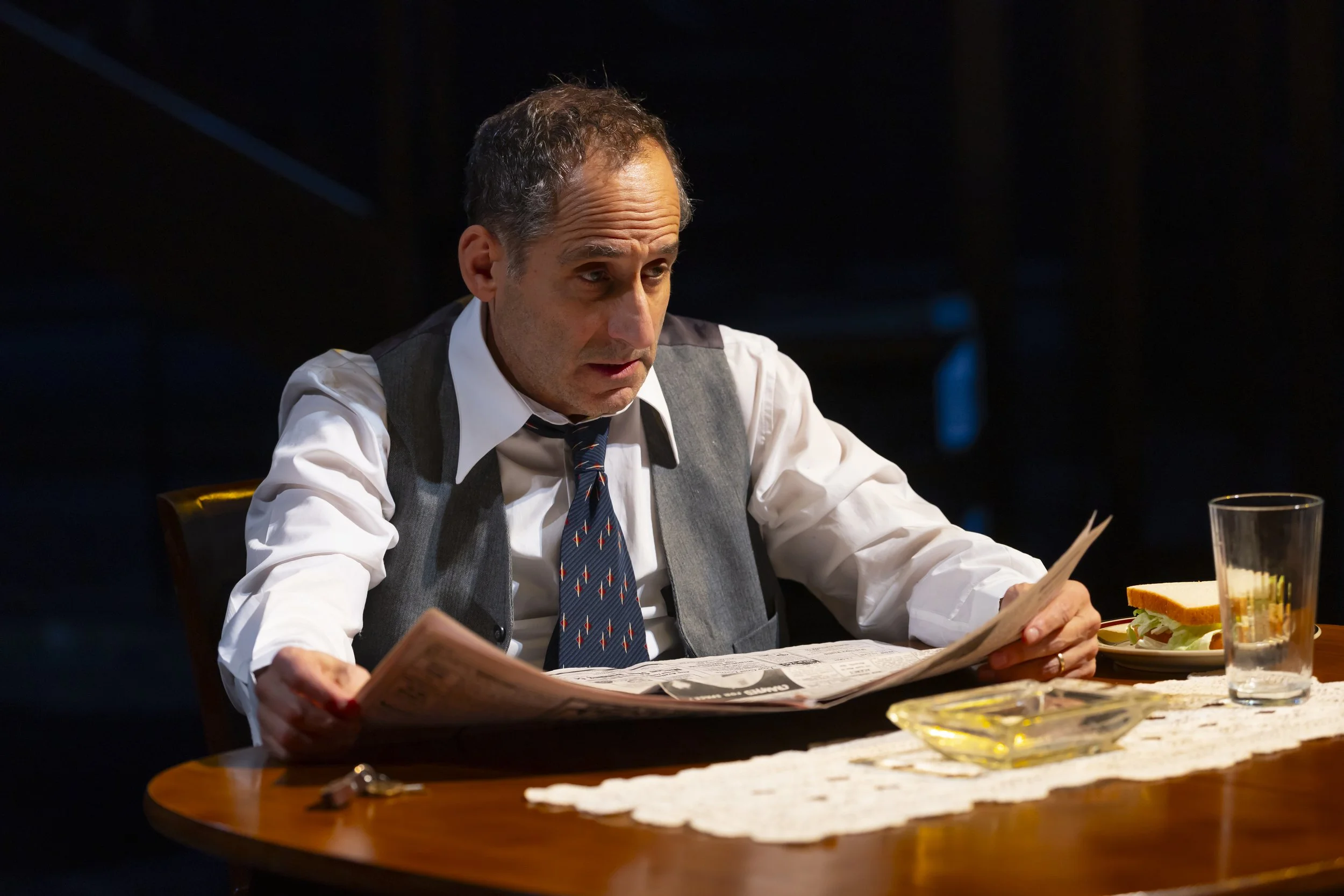 Peter Jacobson's Willy Loman looks and sounds exactly right, which occurred to my mind as "a Jewish Spencer Tracy." The "Tracy aspect" means there is an essential trustworthy, right-minded, homey comfortableness in Willy, and also the kind of affability that makes us believe he once was a major earner as a salesman (though his glory days were the 1920s). Some of that engaging manner still comes through, layered over by hard denials and over-the-top delusions that fuel at times a kind of mania. I came away with so many little "clips" of Jacobson—the way he goes up on his toes (almost everyone is a little taller than he is, or even considerably taller), the donning and removing his jacket as if completely absentminded, the veering so quickly from pleading to demanding or from boundless joy to defeated pathos, and always the hands in movement, speaking a language of their own. It's a genuinely great performance, nuanced and perceptive, and Jacobson's final exit stands out in its use of the Hartford Stage space that impresses as a last glimpse of Willy's lonely, self-absorbed dignity.