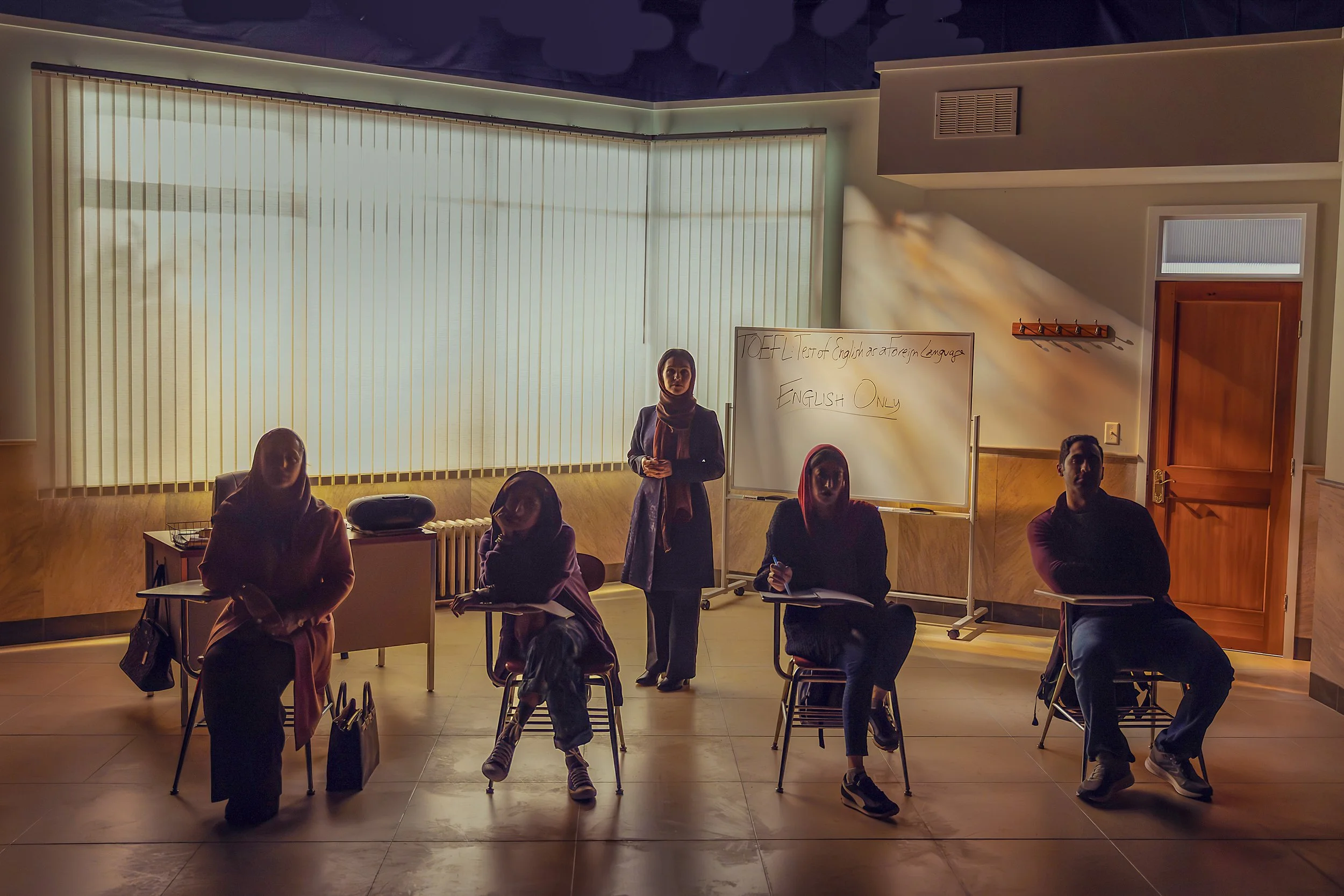 The backstory of Marjan (Neagheen Homaifar), is more intriguing: she spent time abroad in Manchester England, and speaks American English, not without accent. Though asked why she returned to Iran, she never quite explains, but, given her penchant for watching romantic comedies starring Hugh Grant, we suspect it may have had to do with a romance that did or didn't happen. She's now married with a daughter but says she doesn't speak English at home. Her love for the language—she believes conversing in English is one of "the greatest things two people can do together"—is largely restricted to the classroom where she tries her best to keep the students from lapsing into Farsi, their native tongue. Homaifar's excellent portrayal of Marjan shows us someone who is accommodating but also strict. She treats the students as younger than they are, with a tone that makes adults seem to be again in grade school. And, since the level of language she is teaching seems rather basic—we don't see anyone struggling with actually parsing written English—it's easy for her to assert the kindly insistence, somewhat detached yet parental, that seems de rigueur for any classroom teacher. We can't help wanting to know more about her.