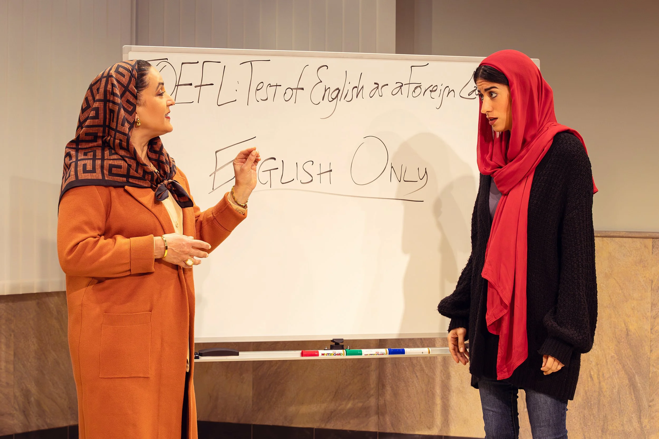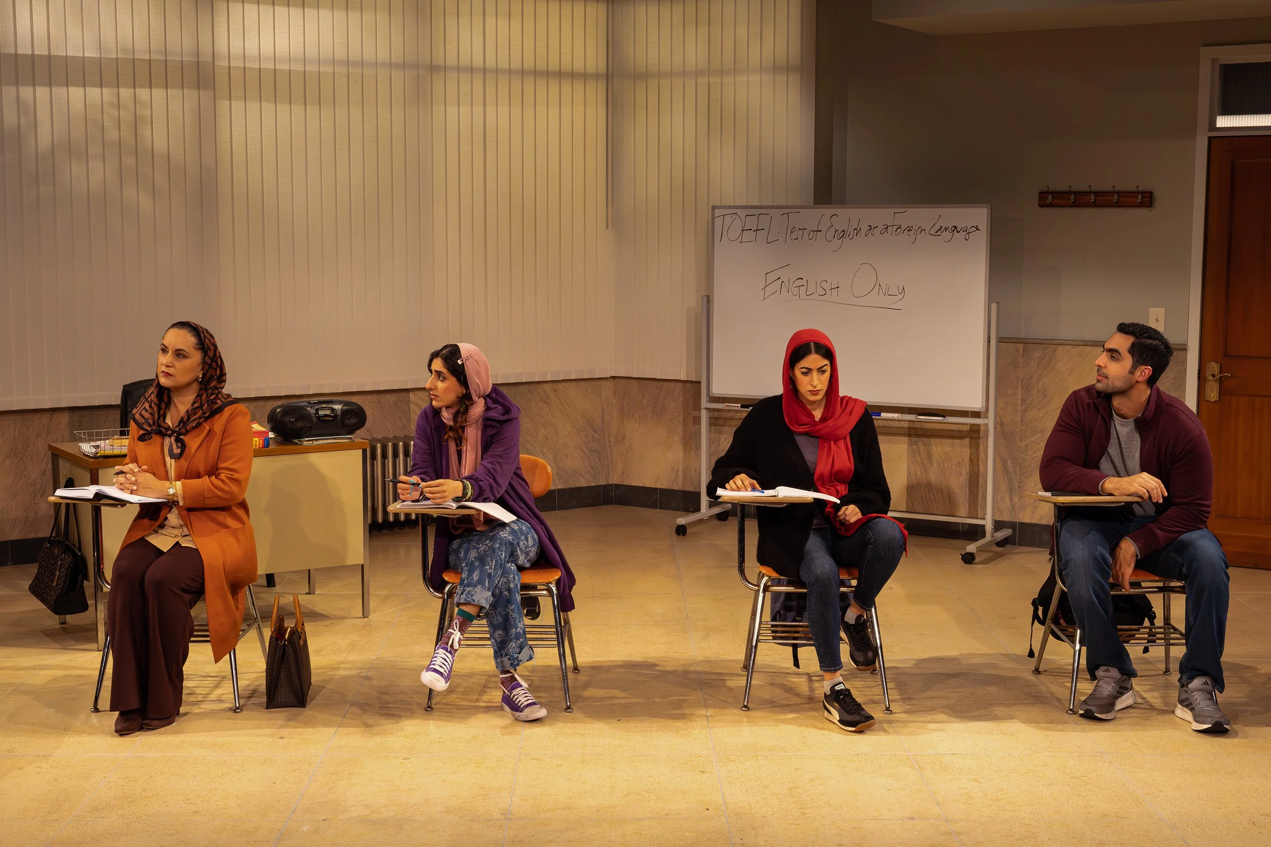 Four student desks, a teacher's desk, a whiteboard on rollers, and a grand window with blinds. A woman enters and writes TOEFL: Test of English as a Foreign Language, and under it: English Only. The classroom is in Iran, and the four students are studying English to enhance their prospects in achieving their goals: for Elham, study in an English-based university, for Omid, to make use of his facility with English; for Roya, to reunite with her son's family expatriated to Canada; for Goli, simply to integrate more easily via the lingua franca of today's world. Goli begins the play by saying: English is like “rice, you can do anything you want with it.” That enabling factor will come under serious scrutiny in the course of Sanaz Toosi's Pulitzer-winning play English, playing at TheaterWorks through November 8. Like the class's teacher Marjan, the play remains upbeat throughout, though with many tensions.