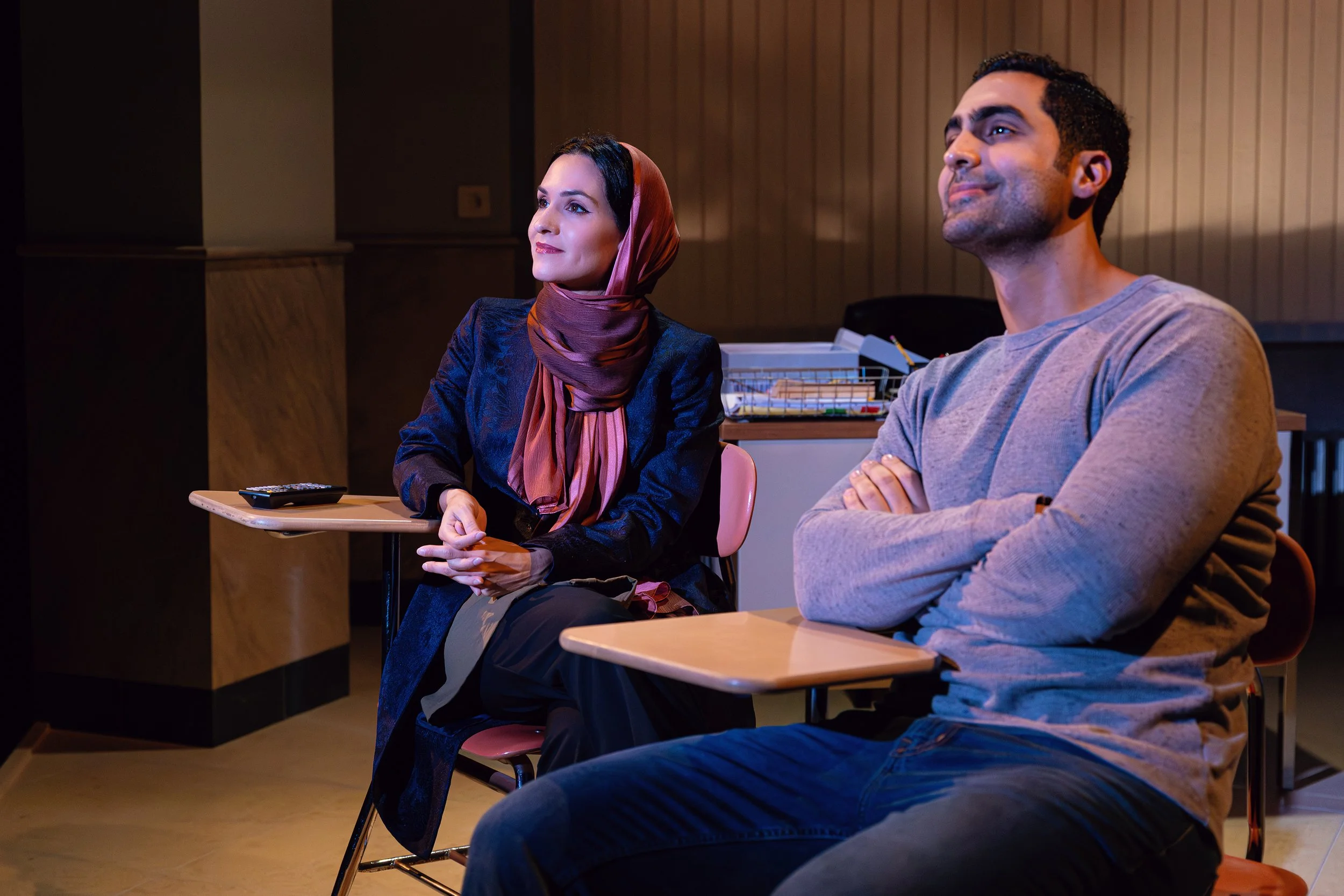 Marjan (Neagheen Homaifar), Omid (Afsheen Misaghi) in English, TheaterWorks Hartford; photo by Julian Brown