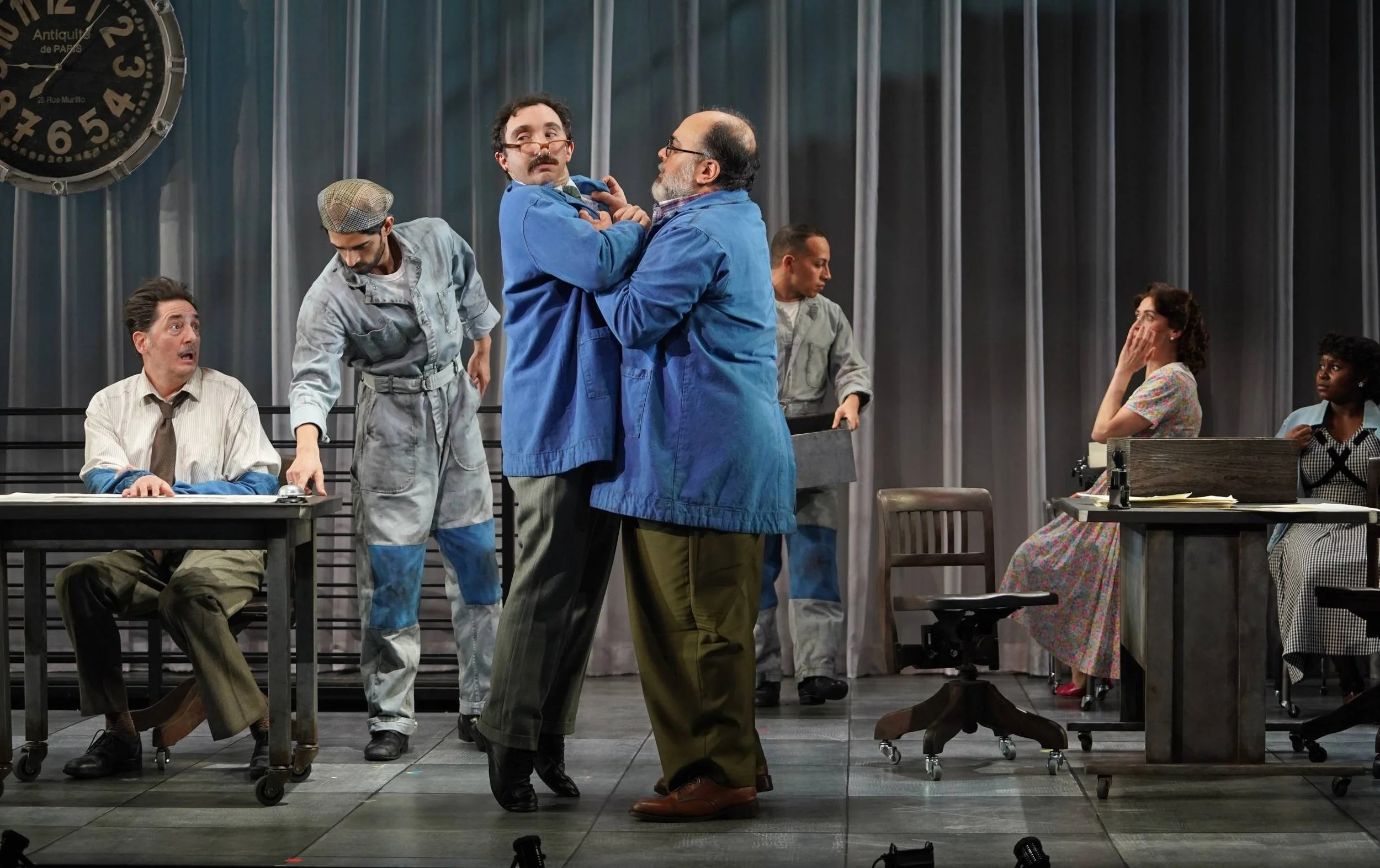 Dudard (Will Dagger), M. Papillon (Tony Manna), Berenger (Reg Rogers), townperson (Ameya Narkar), Mrs. Boeuf (Nicole Michelle Haskins) in Eugene Ionesco’s Rhinoceros, adapted by Frank Galati, directed by Liz Diamond, Yale Repertory Theatre; photo by Carol Rosegg