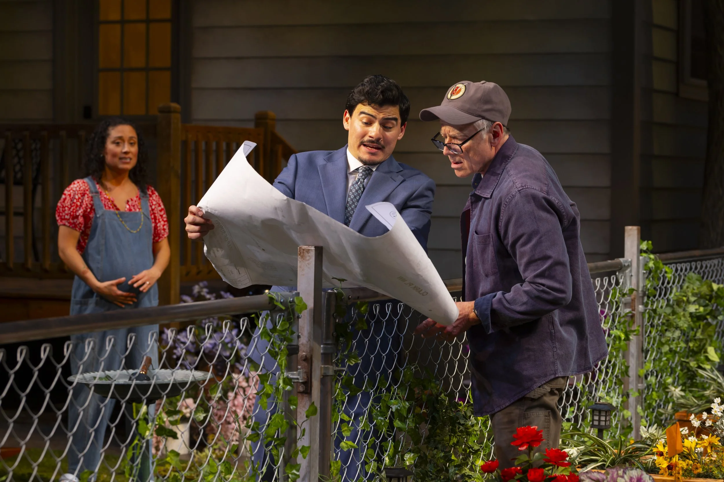 Tania (Alina Collins Maldonado), Pablo (Bradley Tejeda), Frank (Greg Wood) in Native Gardens, Hartford Stage; photo by T. Charles Erickson