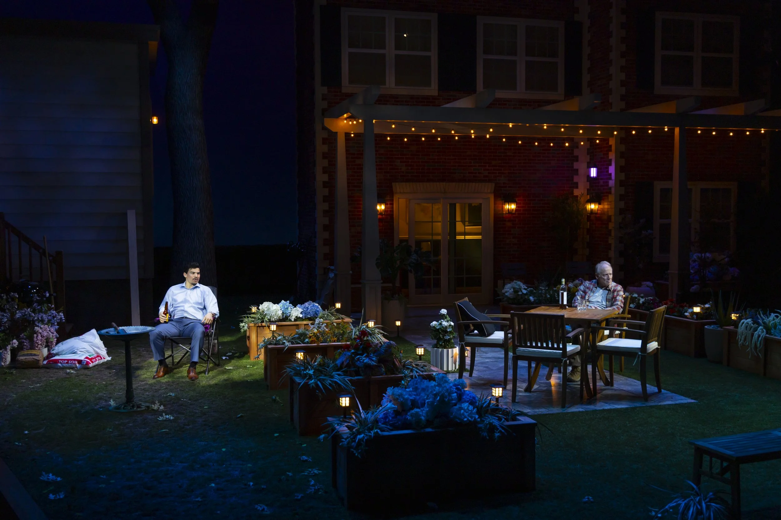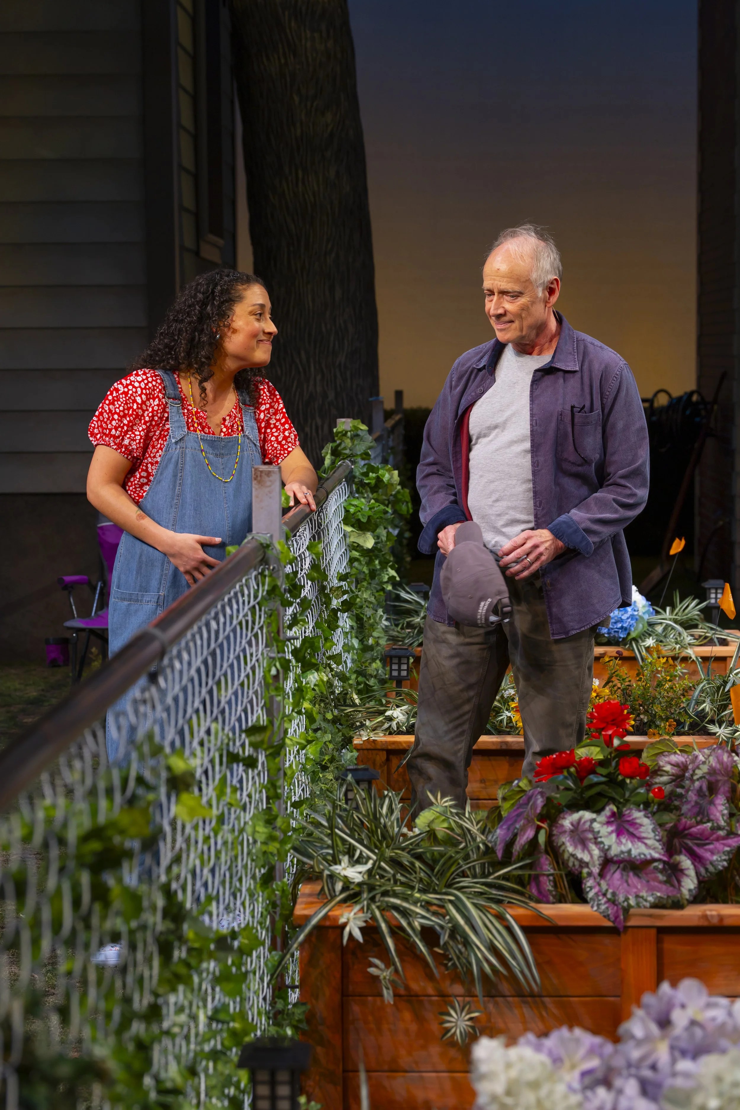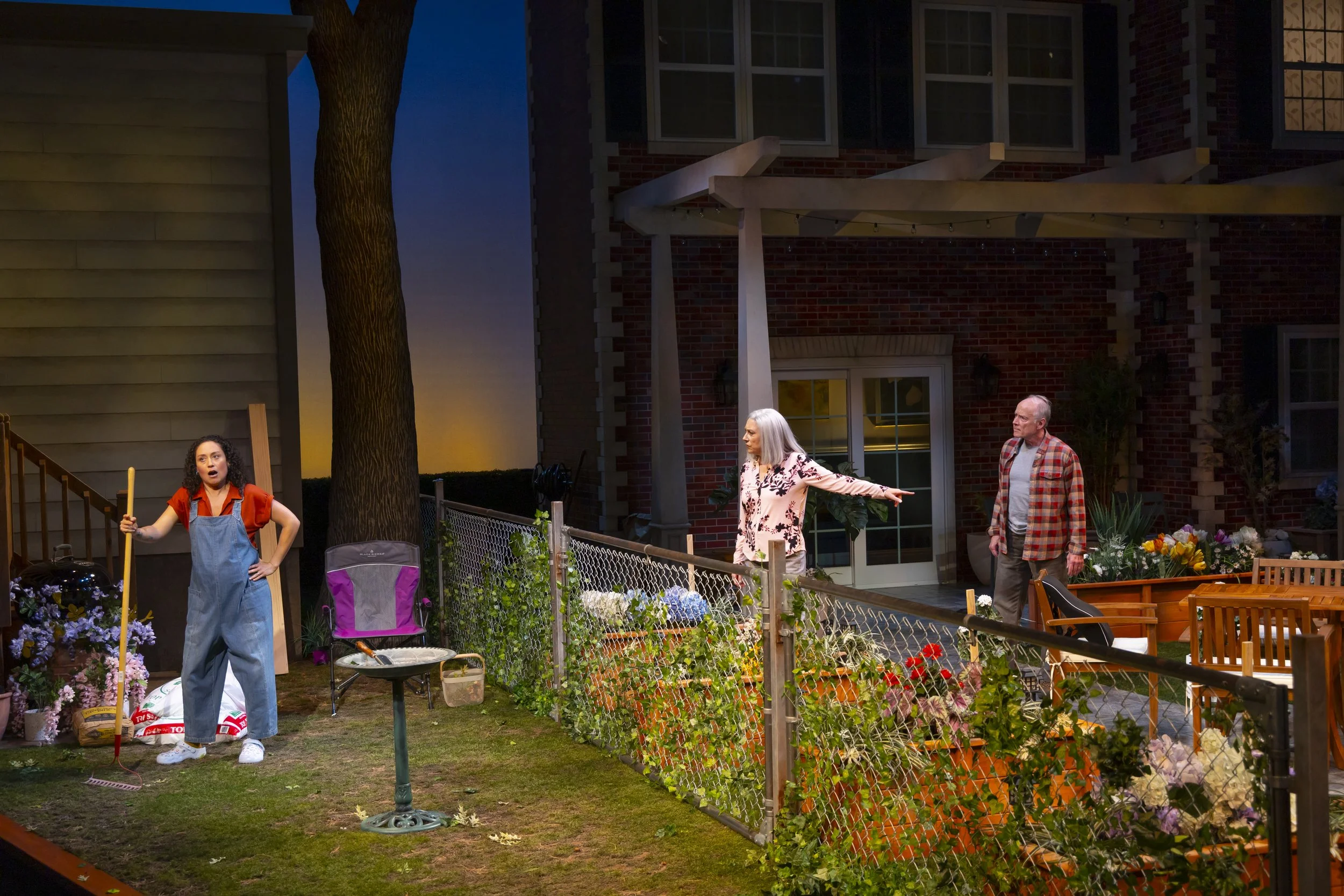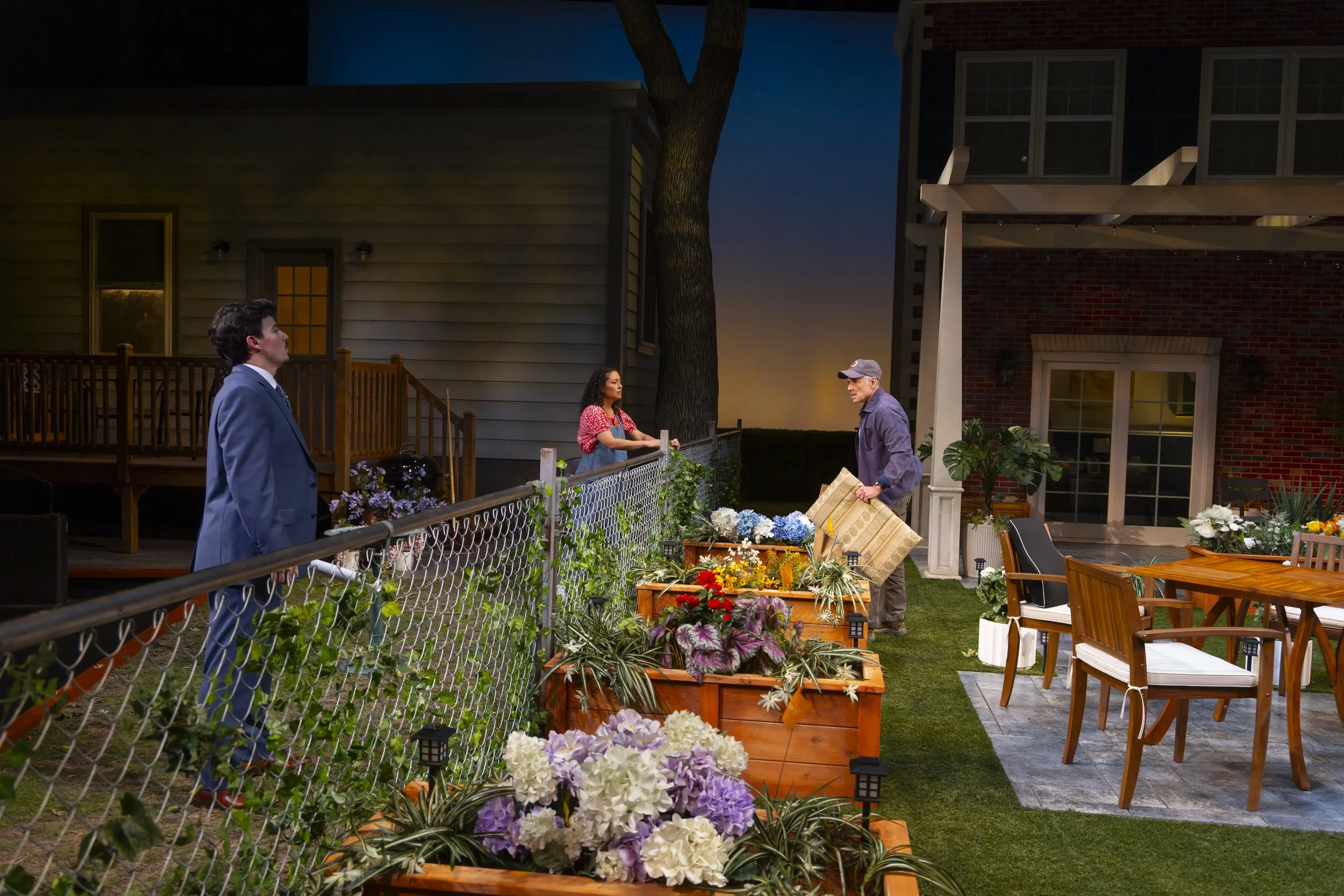 The amphitheater stage at Hartford Stage suits this play remarkably well. Situated above the backyards, the audience can take in the full spectacle of Lawrence E. Moten III's set, which undergoes its own form of character development, aided by a trio of workers. Carla Astudillo-Fisher, Mia Lozada, and Aidan Ramirez enact landscapers tasked with removing the fence, and conduct actual scenic labor while also keeping up a party-time atmosphere that insinuates a Latinx element we sense is new to the neighborhood. When Tania, provoked, curses at Virginia in Spanish, the workers' reactions show how far we are beyond the limits of polite difference of opinion.