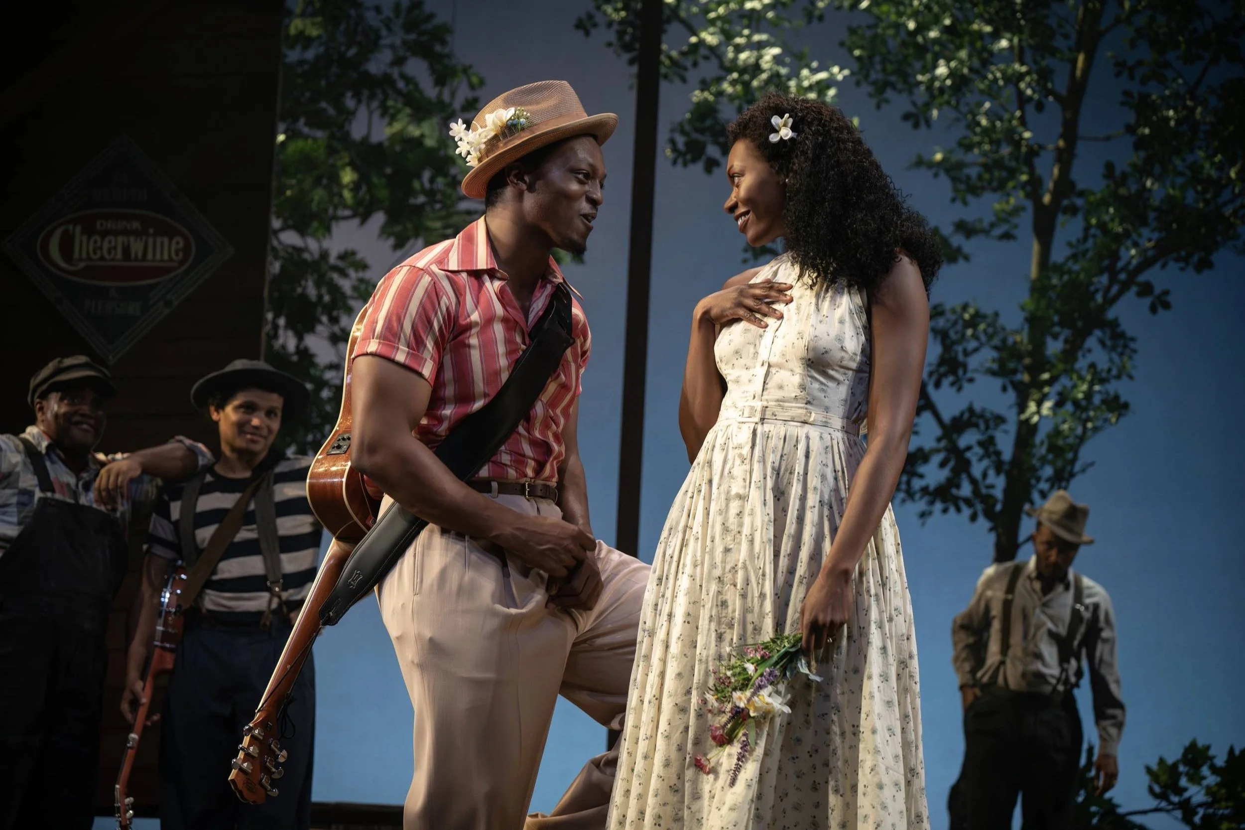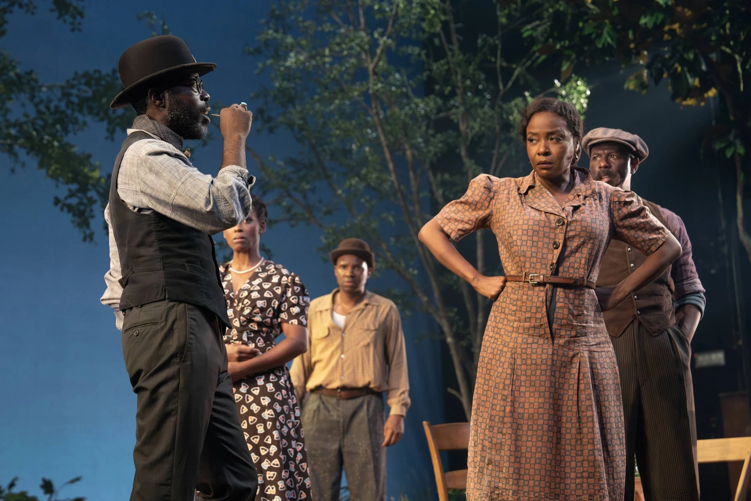 Foreground: J. Quinton Johnson (Spunk) and Kimber Elayne Sprawl (Evalina) with Isiah Reynolds, Alaman Diadhiou, Mikey Corey Hassel in Zora Neale Hurston’s Spunk, Yale Repertory Theatre; photo by Joan Marcus