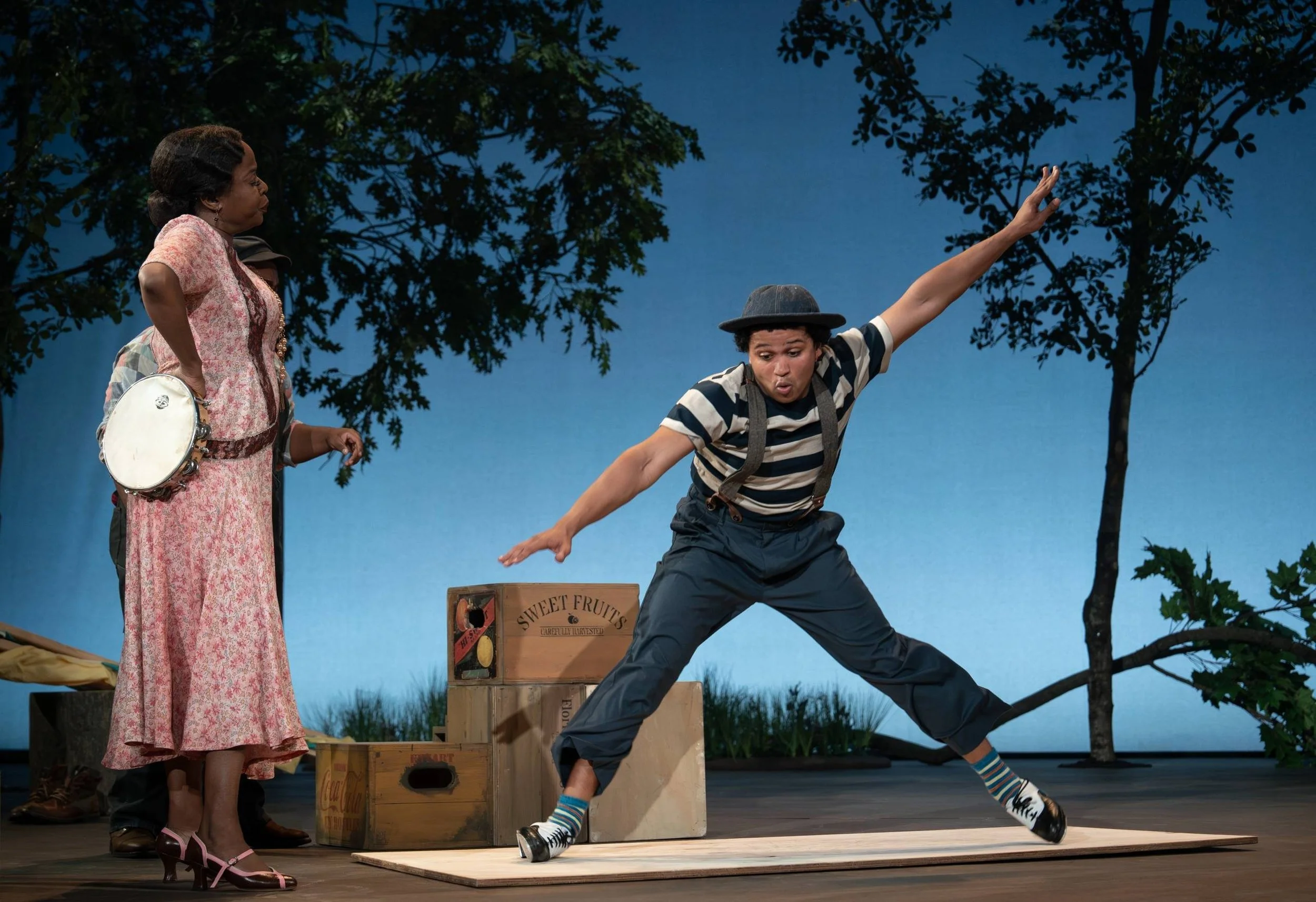 Jeannette Bayardelle (Mrs. Watson), Alaman Diadhiou (Blue Trout) in Zora Neale Hurston’s Spunk, Yale Repertory Theatre; photo by Joan Marcus