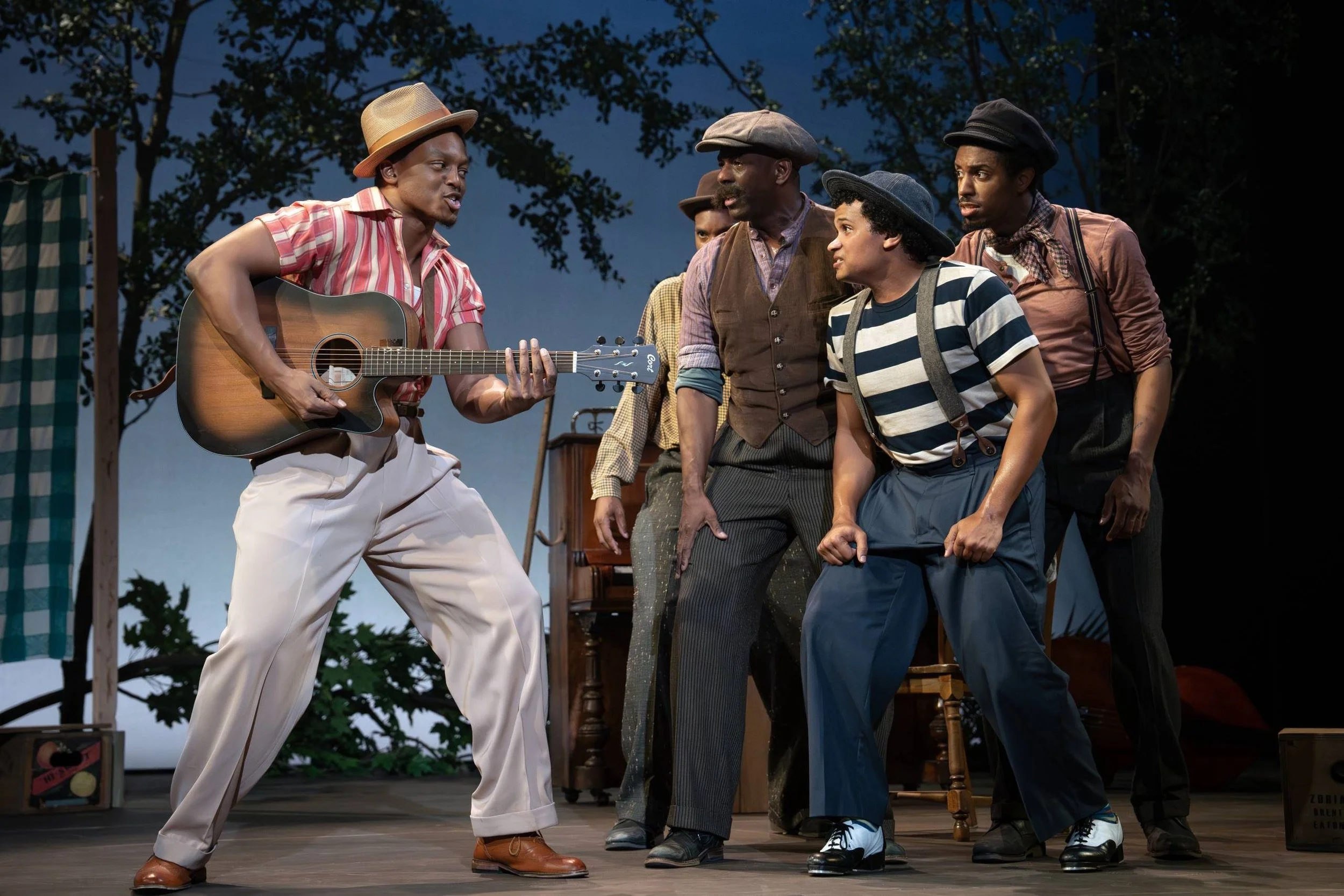 J. Quinton Johnson (Spunk), left, with Shawn Bowers, Correy West, Alaman Diadhiou, Matthew Elijah Webb in Zora Neale Hurston’s Spunk, Yale Repertory Theatre; photo by Joan Marcus