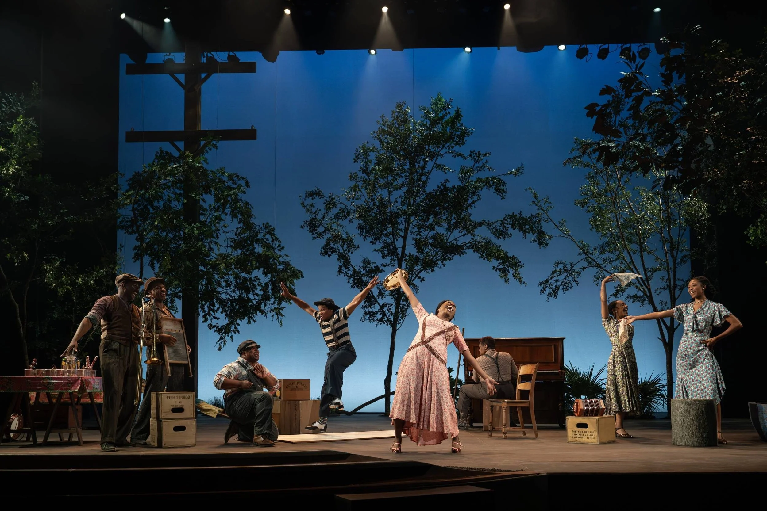 The cast is the very definition of ensemble acting, and, with everyone playing at least one instrument as well, the making of music is a major contribution to the inspiring effect of live theater fully present. A few key roles/performances should be mentioned by name: J. Quinton Johnson has swagger aplenty as Spunk, but there's a soulful earnestness in his demeanor that keeps him from being confused with an arrogant trifler; as his one-and-only, Kimber Elayne Sprawl is easily his match, weighing her every move in terms of what others will think and how she feels; their early duet, "Halimuhfack," establishes their immediate rapport; Jeannette Bayardelle, besides giving "Sing Ye Sinners" a rousing rendition, plays Mrs. Watson with a deadpan charm; as boisterous clown Willie Joe, Shawn Bowers leads the supporting cast, ably abetted by Alaman Diadhiou's show-boating Blue Trout; Kimberley Marable's disappointed Ruby makes the most of her every chance with Spunk, and Charlie Hudson III's Hodge Bishop closes the first Act with a showstopping rendering of humiliation, hatred, and heartbreak.